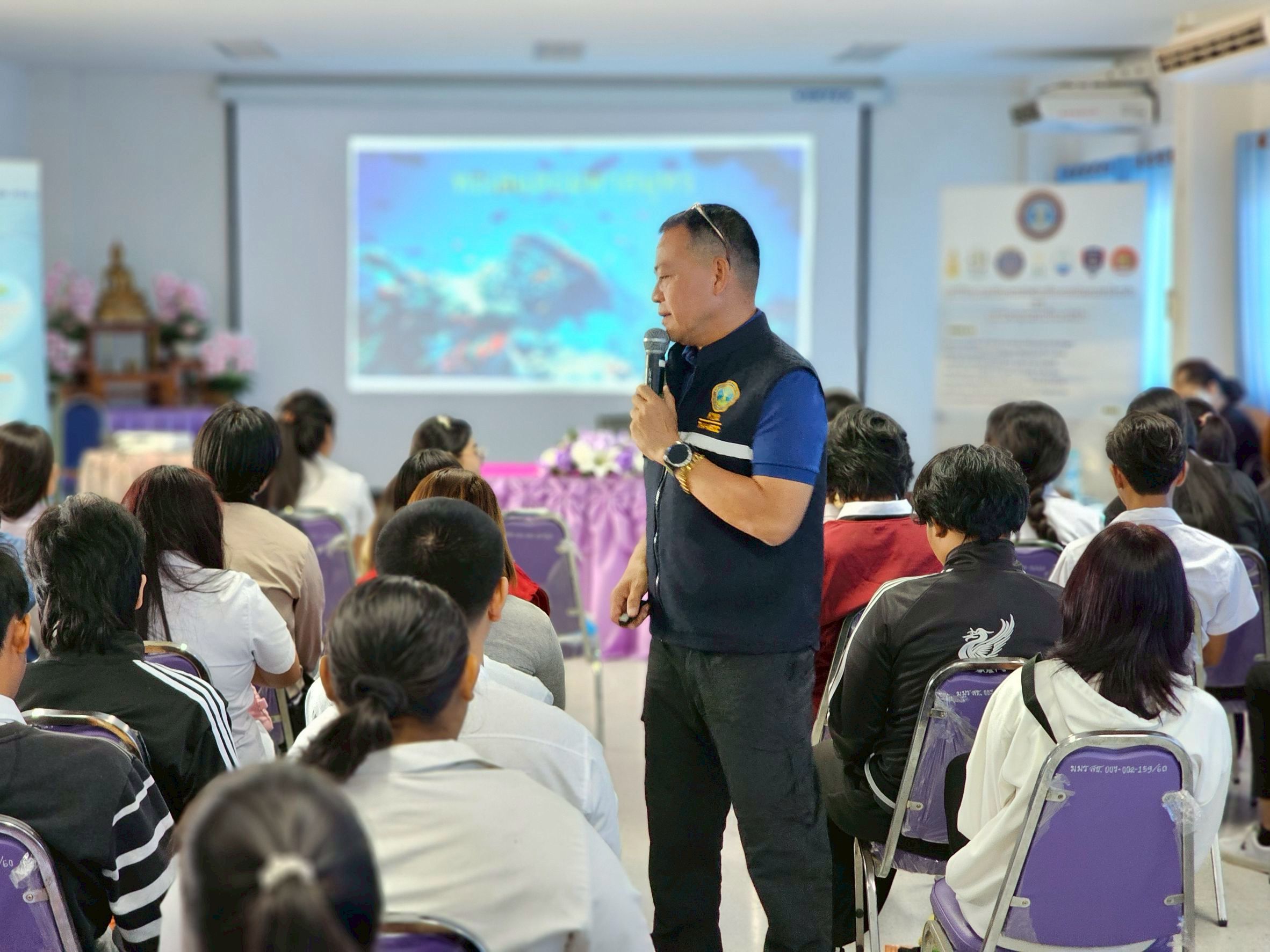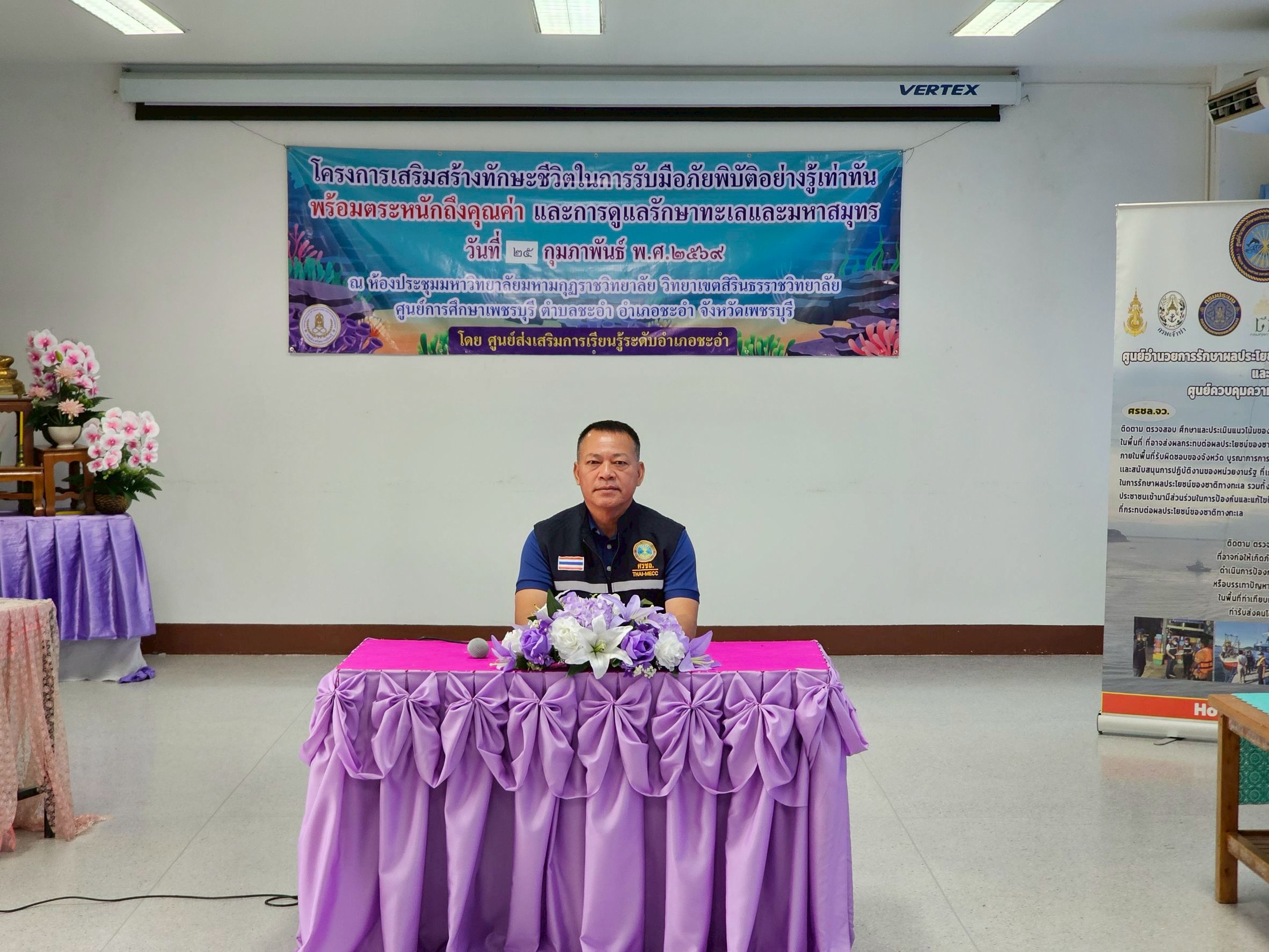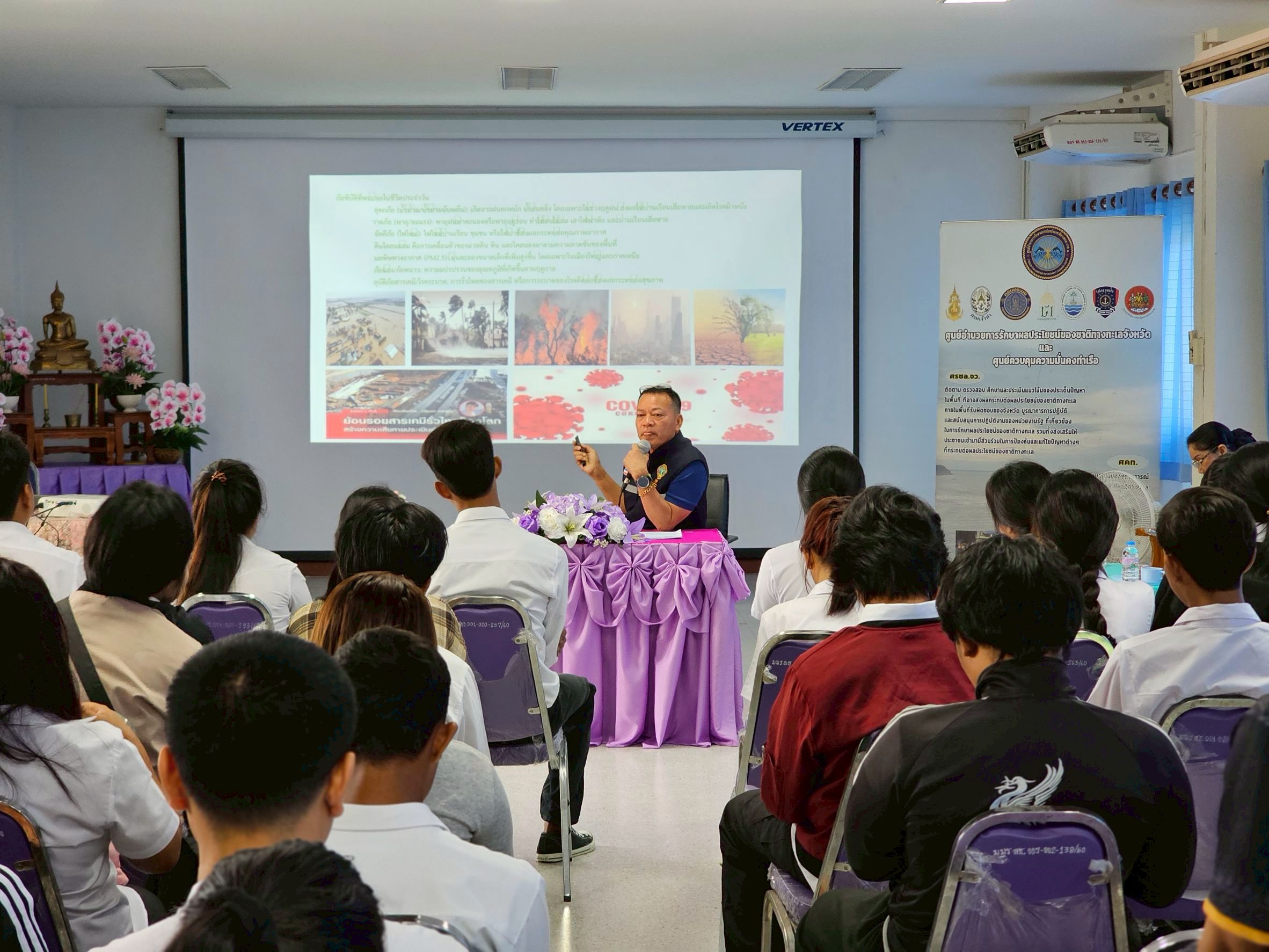 ในวันที่ 25 กุมภาพันธ์ 2569 เวลา 09.30 น. ศูนย์อำนวยการรักษาผลประโยชน์ของชาติทางทะเล จังหวัดเพชรบุรี (ศรชล.จว.พบ.) ภายใต้การอำนวยการของ นาวาเอก จีระ มิตรดี รองผู้อำนวยการ ศรชล.จังหวัดเพชรบุรี บูรณาการความร่วมมือกับ ศูนย์การเรียนรู้ระดับอำเภอชะอำ (กศน.อำเภอชะอำ) จัดกิจกรรมพัฒนาคุณภาพผู้เรียน ภายใต้ "โครงการเสริมสร้างทักษะชีวิตในการรับมือภัยพิบัติอย่างรู้ทัน พร้อมตระหนักถึงคุณค่าของการดูแลรักษาทะเลและมหาสมุทร" ณ ห้องประชุมมหาวิทยาลัยมหามกุฏราชวิทยาลัย วิทยาเขตสิรินธรวิทยาลัย ศูนย์การศึกษาเพชรบุรี ตำบลชะอำ อำเภอชะอำ จังหวัดเพชรบุรี