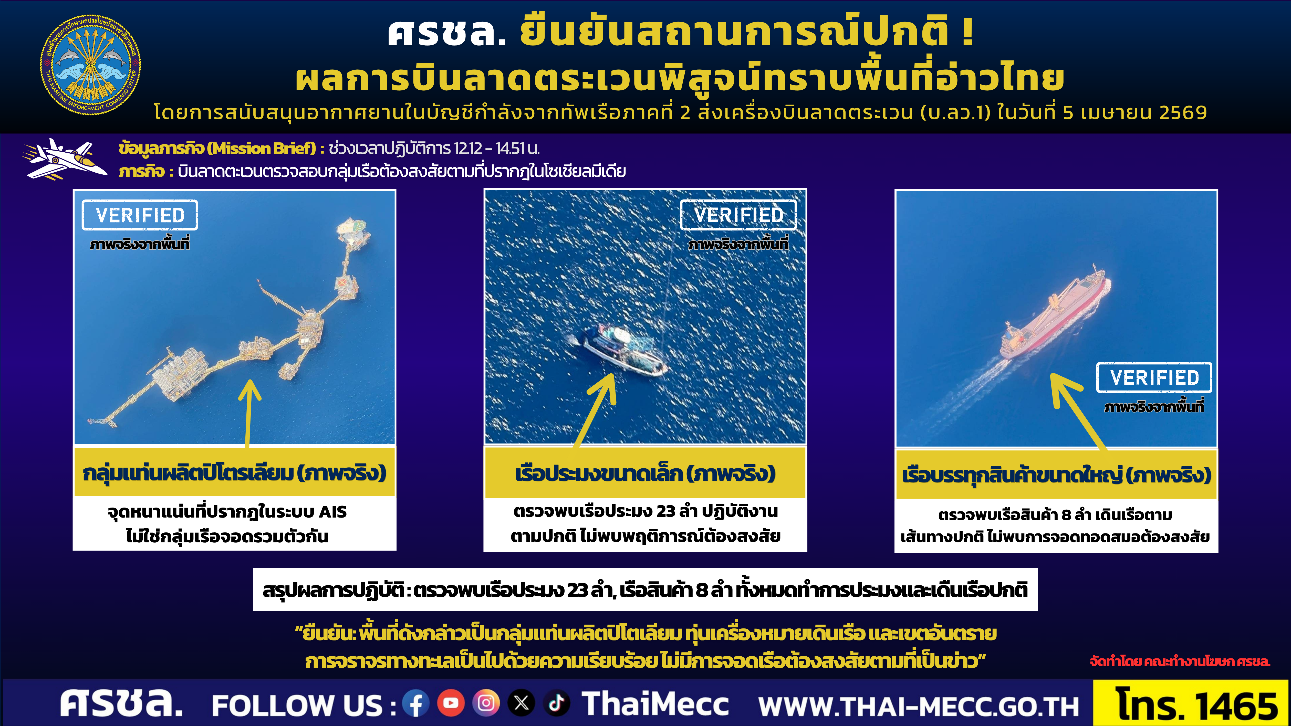 ศูนย์อำนวยการรักษาผลประโยชน์ของชาติทางทะเล (ศรชล.) โดยคณะทำงานโฆษก ศรชล. เปิดเผยรายงานผลการปฏิบัติการเชิงรุก กรณีมีการแชร์ภาพจากระบบ ระบบระบุพิกัดแสดงตนอัตโนมัติ (Automatic Identification System: AIS) ที่แสดงให้เห็นกลุ่มเรือหนาแน่นกลางอ่าวไทย จนเกิดความกังวลในสื่อสังคมออนไลน์ ล่าสุดเมื่อวันที่ 5 เมษายน 2569 ระหว่างเวลา 12.12 - 14.51 น. ศรชล. โดยการสนับสนุนอากาศยานในบัญชีกำลังจากทัพเรือภาคที่ 2 ส่งเครื่องบินลาดตระเวน (บ.ลว.1) ขึ้นบินตรวจสอบพื้นที่เป้าหมายเพื่อพิสูจน์ทราบข้อเท็จจริง โดยมีผลการปฏิบัติที่สำคัญดังนี้